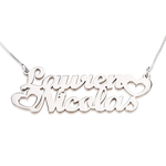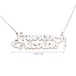 The Two Name Necklace with Hearts in Between is the great Gift for your loved one. You can Customize 2 Names of your Choice in that Necklace. The two names was connected by hearts. The Necklace Gives Stunning Look to the who wears it. It comes in 5 different Materials such as Sterling Silver, Gold Plated, Rose Gold Plated, 14k Gold and 14k White Gold. Available Chain lengths are 14" , 16" , 18" , 20" , 22" . Engrave yours Now!